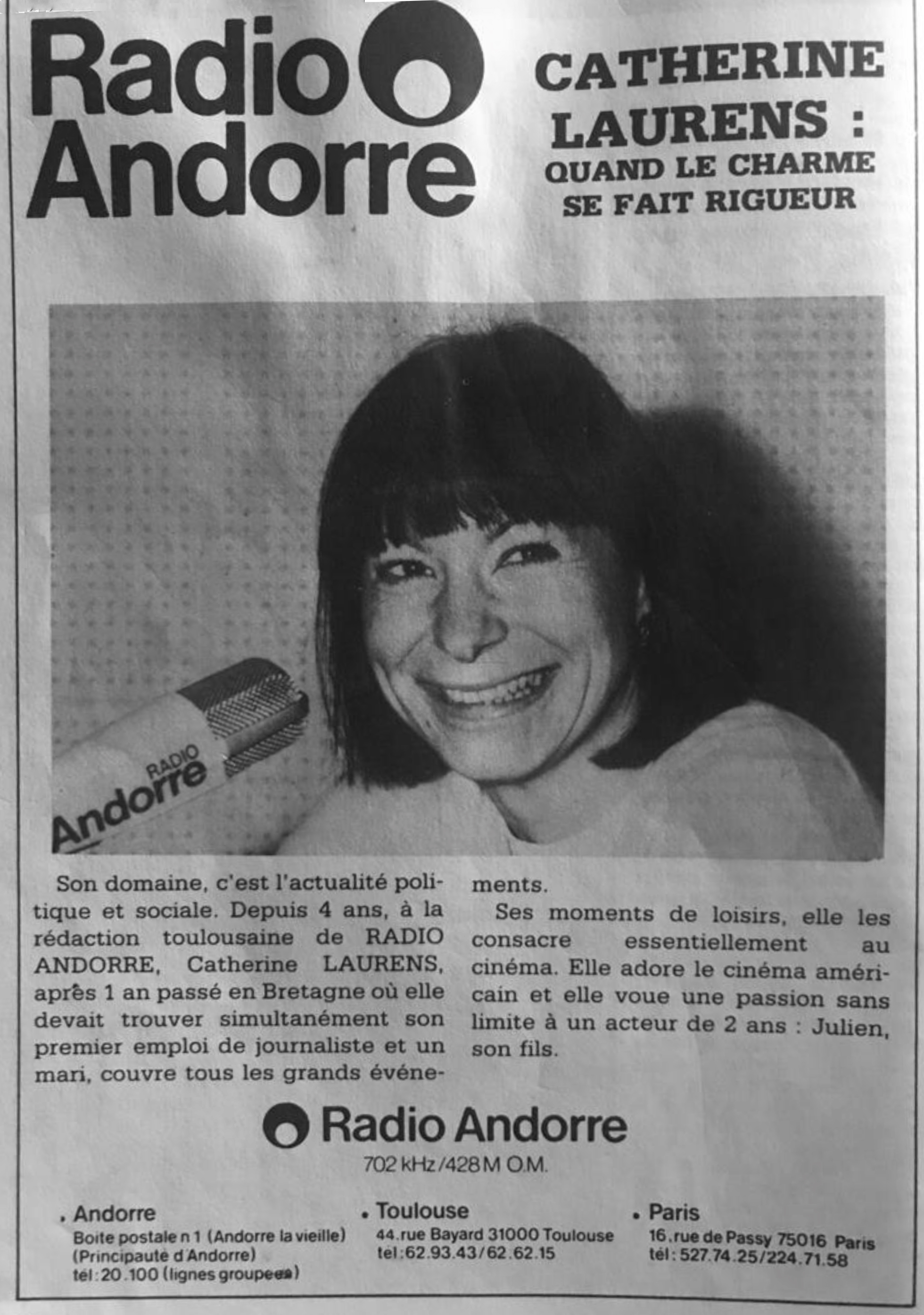 Catherine Laurens est embauchée à 22 ans par Gilles Marquet comme journaliste de Radio-Andorre à Toulouse. Elle est chargée des interviews et reportages à Toulouse et dans les départements de l'intérieur. Le studio de Toulouse, 44 rue Bayard, est à l'époque aménagé de manière très sommaire dans un appartement de ce quartier de la gare.