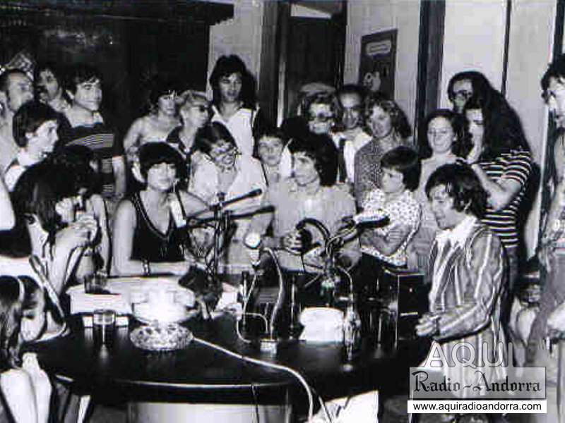 19. Une grande partie de l'équipe de Radio Andorre et de celle d'Eddie Barclay. On peut reconnaître sur cette photo, Gilles et Jean-Louis Marquet, Eddie Barclay, Léo Missir, Pierre Péchin et parmi les animateurs et techniciens de la station : Alain Tibolla, Lionel Cassan, Ramon Sanchez, Michel Borry, Dany Marchal, Max Laffontaine, Michel Cotet... et d'autres qui ne demandent qu'à être identifiés.