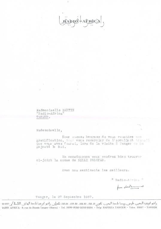 Lettre de remerciement de Jean de Bournet, Directeur de Radio Africa.